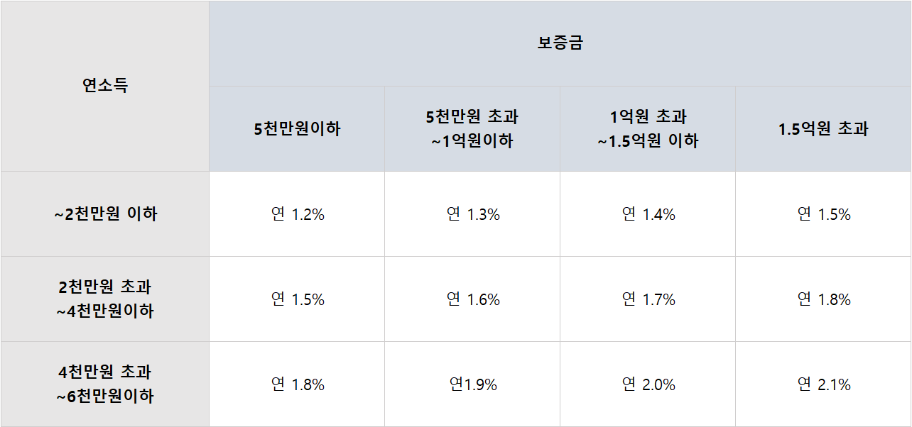 예를 들어 연소득 2천만원 이하 보증금 5천만원 이하는 이자를 1.2%를 내게되며, 연소득 4천만원 이하 보증금 5천만원에서 1억원은 1.6% 이자를 내게 됩니다. 최대 금리는 연소득 6천만원 이하면서 보증금이 1.5억원이 초과될 시 2.1%가 부과됩니다. 자세한 표는 위에 이미지로 첨부드리니 자신에게 맞는 대출 금리는 어떤 것인지 확인해 보시기 바랍니다.