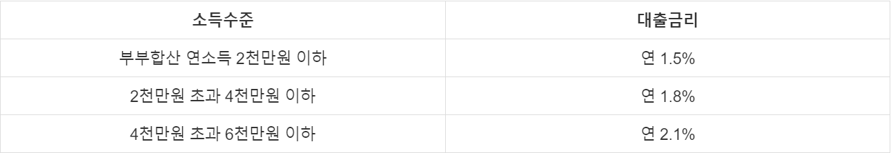 대출에서 가장 중요한 것은 바로 대출 금리입니다. 대출 금리가 높아지느냐 낮아지느냐에 따라 은행에 매월 납부해야하는 이자가 달라지기 때문입니다. 2023년 2월 10일 기준 국토교통부 고시에 따른 변동금리를 알려드리겠습니다. 소득 수준이 부부합산 연소득 2천만원 이하일 경우 대출금리는 연 1.5%, 소득 수준이 2천만원 초과 4천만원 이하일 경우 대출금리는 연 1.8%, 소득 수준이 4천만원 초과 6천만원 이하일 경우 대출금리는 연 2.1%입니다. 소득수준이 낮을수록 낮은 이자로 가계 경제의 부담을 덜 수 있습니다.